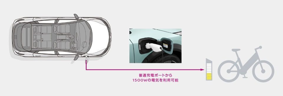 また、充電ポートに接続できる「AC外部給電コネクター」を使用すると、ドアがロック状態でも1,500Wの電力を使用することができ、災害時などの非常用電源として利用することができます。